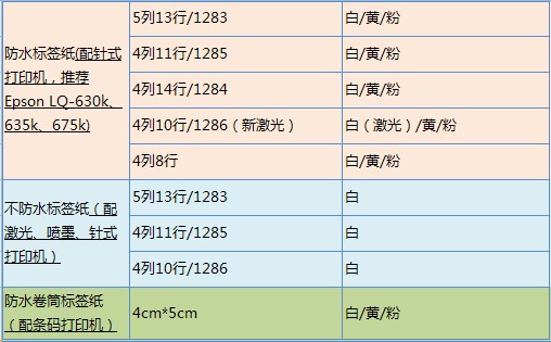 1)防水A4标签纸用针式打印机,推荐使用Epson LQ-630k,Epson LQ-635k,Epson LQ-675k,或Oki的机器。 2)不防水的A4标签纸,用针式打印机、喷墨打印机、激光打印机都可以 3)卷筒标签纸,推荐用卷筒打印机。建议使用北洋 BTP-2200E和博思得 C168。